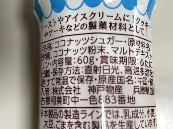 原材料は至ってシンプル。砂糖、ココナッツ粉末、マルトデキストリン、これだけである。