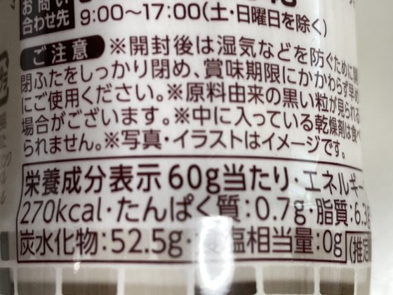 60グラムで270キロカロリーだから、100グラムで450キロカロリー。砂糖100グラムでは387キロカロリーだから、砂糖よりも高カロリーである。砂糖の代わりに使えば糖尿病になりかねない。