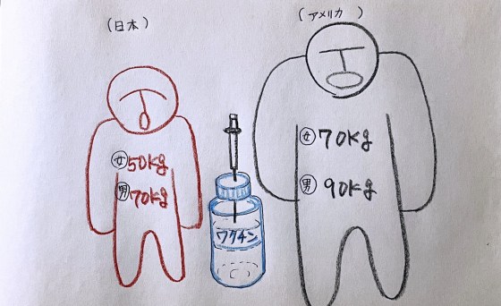 日本人成人の平均体重は男性約70kg、女性は約50kgで、 アメリカ人は男性約90kg、女性約75kgであり、50キロの人も90キロの人とも同じ量のワクチンを接種している。
