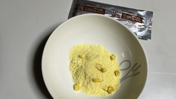 熱湯を注いで試食。減塩のもので本当に塩分をほとんど感じないものもあるが、このポタージュは十分に塩分の味がする。カリウムを加えて食塩の補いとしているからであろう。ただ、砂糖の甘みが強いように感じた。もともと甘党ではないので余計にそう感じただけなのかもしれない。