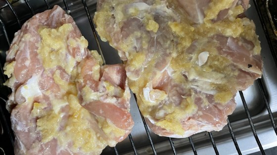 もも肉の裏表にたっぷり塩レモンを塗り付けて網で焼く。