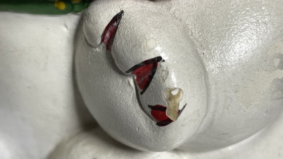 色んな招き猫を集めているが、こんな招き猫は見たことがない。全体的に古ーい感じであちこち傷んでいる。