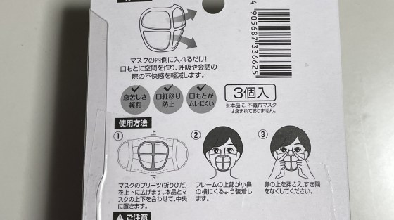 いろんなマスク用のインナーフレームが出ているが、この100均のインナーフレームは今のところナンバーワンである。