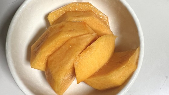 皮を剥いて試食。甘くて熟している割には、ドロッとしていないしつぶれない。甘くて今にも熟しそうなのに、歯ごたえがある不思議な柿である。