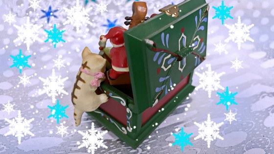 サンタさんがベースを弾いていて、猫ちゃんが箱にしがみついている。