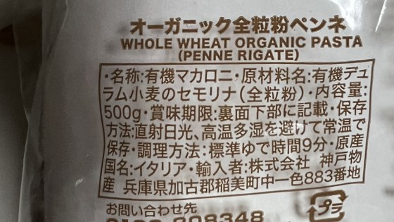 業務スーパーで見かけたイタリア産有機全粒粉のペンネ。以前オール全粒粉のパンを食べてかなりまずかったので、なかなか手が出なかったが、思い切って買ってみた。