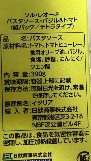 トマトピューレ、オリーブ油、バジル、ニンニクに食塩、砂糖、クエン酸を加えたものである。添加物がないのはいい。