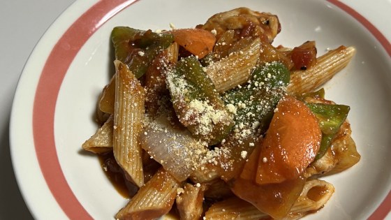 あらびきミンチ、ニンジン、玉ねぎ、ピーマンを炒めて、パスタソースを加え、ペンネを加えて粉チーズを振りかけて出来上がり。
