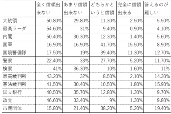 「次第に不満の矛先は、既成政治へと向けられていった。表2は2018年度の社会機関の信頼度である。国軍や国境警備隊などの軍事組織への信頼度は相対的に高いものの、大統領や議会、裁判所、検察などの政府機関に対する信頼度は軒並み低い。軍を除いて、政府の諸機関が信頼出来ないと答えた国民は、7割から8割にまで及んでいる。2018年時点のポロシェンコ大統領の支持率も約13%しかなかった。」