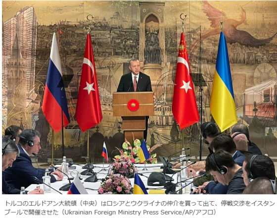 エルドアン大統領はロシア軍の侵攻以降、ロシアのプーチン大統領、ウクライナのゼレンスキー大統領と電話会談で停戦を仲介、3月10日には南部アンタルヤでロシアのラブロフ、ウクライナのクレバ両氏の外相会談を実現させた。続いて、3月29日にはイスタンブールで停戦交渉を開催、トルコの存在感を世界に誇示した。
