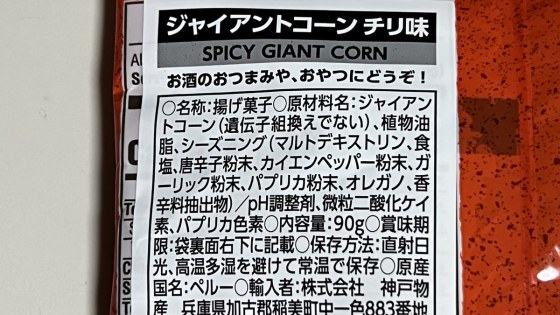 このジャイアントコーンの味付けは、食塩、唐辛子、ガーリック、パプリカ、オレガノなどである。