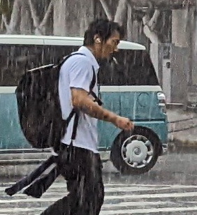 しかし、この男性、くわえタバコである。ろうそくでさえ火が消えるほどの激しい雨の中で、果たしてタバコの火はついているのだろうか。しかし、煙らしきものが見えない。このタバコはまっがっているので普通のタバコである。兎に角、煙草に対するすごい執念である。重度のニコチン中毒か?とにかく写真を撮ろうとしたが手が濡れていてスマホもびしょびしょであったが、そこはわが息子、素早くカシャカシャとスマホで撮った。息子も唖然として驚いたらしい。私が写真、写真と慌てているのを見て間髪入れずシャッターを切ったと言う。この一枚だけがうまく撮れていた。この人は30分前まで空は明るかったので、きっと傘を持たずに出てきたのだろう。傘をさしていた私たちでさえこんな有様なのだから、きっとこの男性は悲惨な状態になっているはずである。ただ、普通と違うのは、口から煙草を離さないこの根性。きっと最近ではタバコも高くなったからなあとは思うが、ここまで死守するとは。