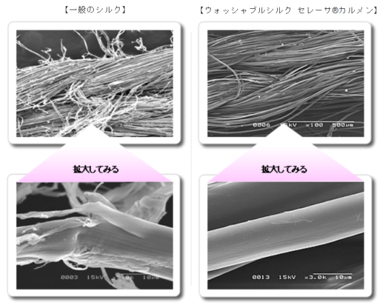 シルクはつるつるだというのは思い込みである。生のままのシルクは、表面は意外とザラザラである。ウォシャブル過去を施したシルクはつるつるである。