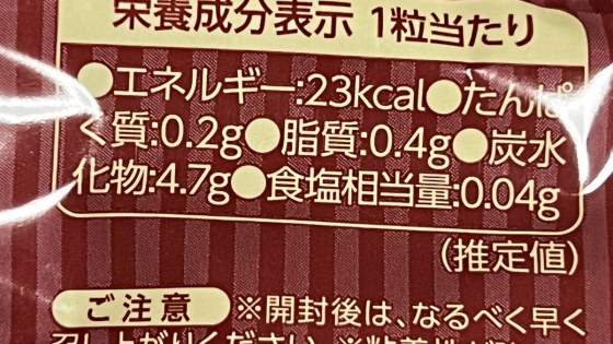 1粒当たり23㎉であるから、日本製のキャラメルとほぼ同じである。