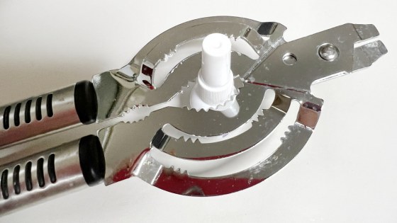硬くて開けにくいビンのフタも楽に開けられるビンオープナーで、ハンドルをてこの原理で軽く回すだけ。フタの大きさに合わせて、直径2.5cm~11cmまで対応している。