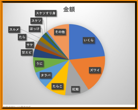 ・かなり減るのは、イクラ、ズワイ、タラバ。