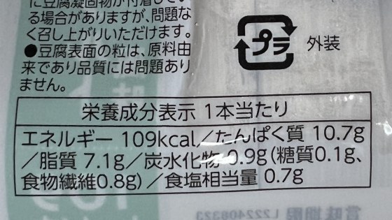 これ1本で109㎉と低カロリーである。糖質も塩分も少ない。