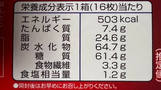 カロリー的には100グラム当たり約330㎉だからそれほど高カロリーでもない。全粒粉小麦が入っているので、食物繊維も少しではあるが含まれている。この全粒粉がビスケットのパリパリ感を出している。