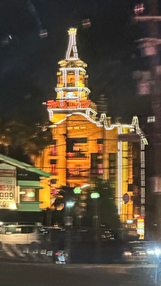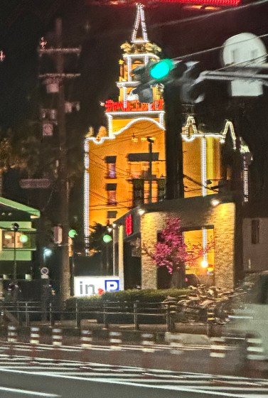 自動車で通り過ぎる一瞬であったので、シャッターを押しまくったら2~3枚はどうにか撮れていた。昼間見るのと違ってネオンサインを配しLEDの照明でライトアップされた竜宮城は真に夢のようなお城であった。