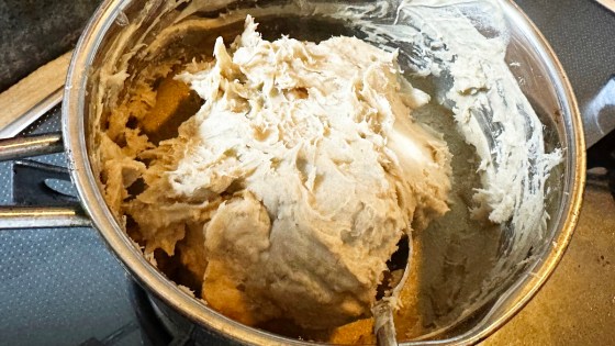 中火にかけて固まってきたら弱火にしてよくかき混ぜる。腕がだるくなる。