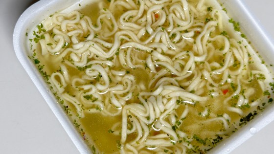 粉末スープを入れたのち、線のところまでお湯を入れて3分待つと出来上がり。ペペロン味のラーメンである。