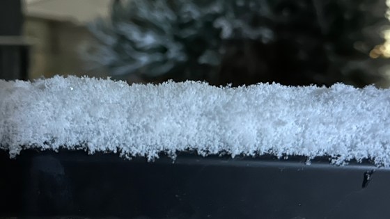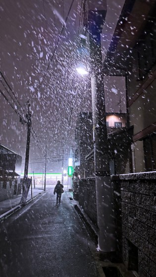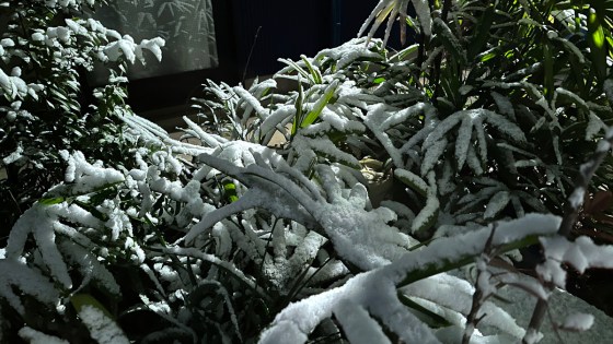 と、ブログを書いて、ぶつぶつ言いながら夕食の準備をして食事をしようとしてウエザーニュースを見たら、なんだか雪が降っているようで慌ててベランダに出てみるとベランダの手すりに雪が積もっているではないか。狐につままれたような気分。