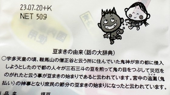 「福まめ」と書かれた炒り大豆の袋の裏に豆まきの由来が書かれている。