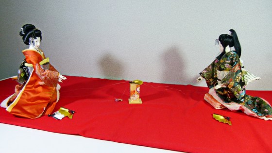 正式な道具としては、銀杏(いちょう)の形をした的、10×10×20センチぐらいの桐箱、なるべく軽い扇子、赤い毛氈。床の間にひな人形があれば言うことはない。ひと時、江戸時代へタイムスリップすることができる。