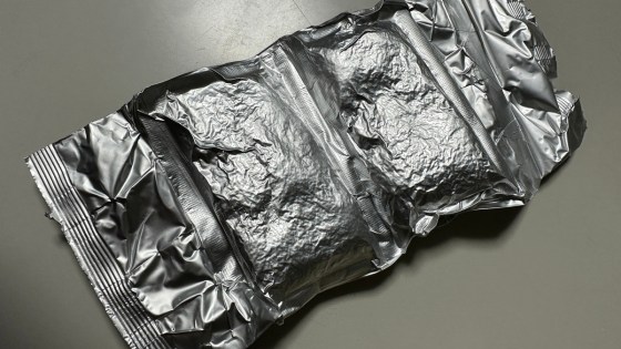 これはお茶の真空パックであるが、この袋は、真空蒸着ではなくアルミ箔とポリフィルムを張り合わせたもののようである。
