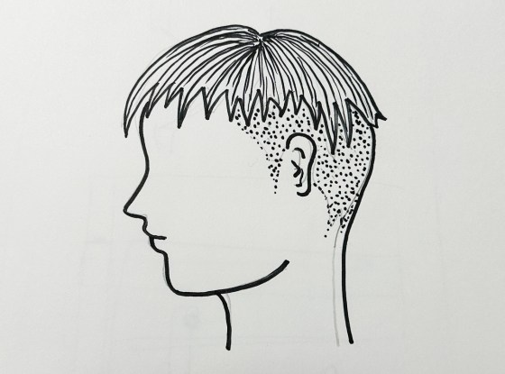 ヘアスタイルの絵を描いてみたが、実際はこんなものではない。もっともっとひどい状態で左右が全く違っていて目も当てられない。