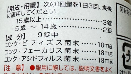 食後に1錠飲めばよい。1日3回で3錠飲むと、1兆個の乳酸菌やビフィズス菌をとったことになるらしい。