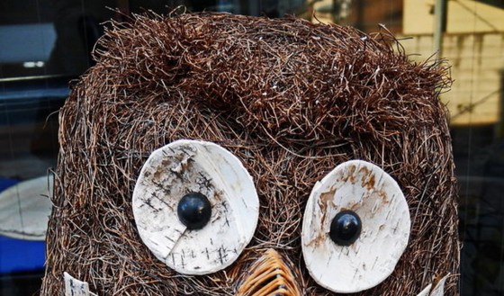 何度もこの前を通っているのによく見たことがなかった。お店が閉店になった時、このフクロウをやっとよく見てみたらなんと手作りである様な。