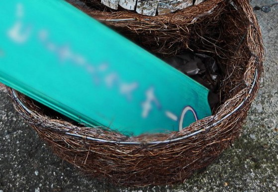 体の部分は棕櫚で出来ている。黒い眼はシートを止める大きなピンである。目の白い部分は何だかよく分からないプラスティックを切って作ってある。経年変化で表面が劣化しているが、これもいい味になっている。