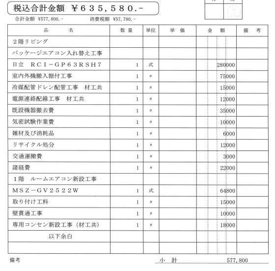 ただ、業務用の天井型をつけていたので工事費なども高いだろうと心配していたが思いの外安かった。知り合いの家の場合、同じような機種なのに90万円ぐらいの見積もりあった。最後に今回の領収書の画像をあげておいた。