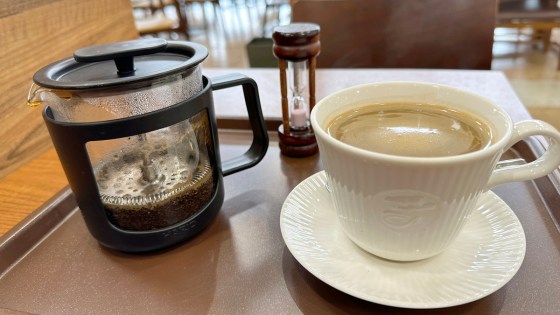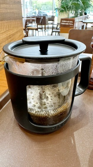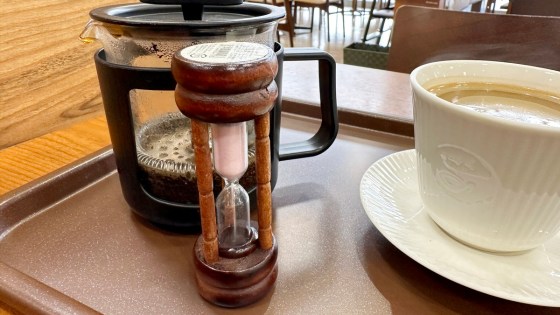 現在、阪大の歯学科で歯の治療をしている。奥歯の歯根を抜いて大変だった。終わってから、1階にあるカフェに行ってコーヒーを飲もうと思ってメニューを見ていたら、カフェインレスのコーヒーというのが下の方にあった。ちょっと珍しいと思って注文してみた。普通のコーヒーには、SMLがあるが、カフェインレスにはない。どうしてなのかと思っていると、トレーにコーヒープレスと砂時計とカップが乗せられて手渡された。