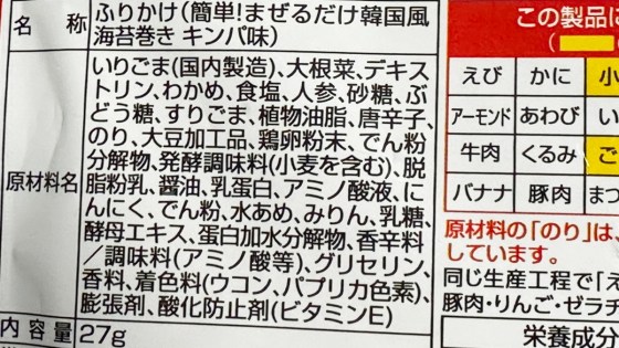 息子に貰った「きんぱ味のフリカケ」。フリカケだからご飯にかけて食べたりきんぱの巻きずしを作る時に使うのが普通であるが、生野菜のサラダや和え物の味付けに使うと思いの外おいしい。
