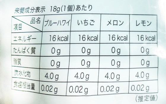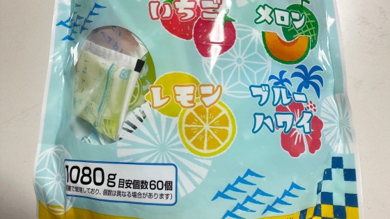 約1キロで60個ぐらい入っているらしい。種類は、いちご、メロン、レモン、ブルーハワイの4種類。
