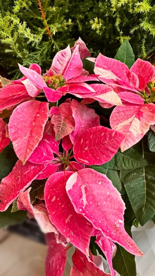寒い冬に花の代わりになった赤いポインセチアやピンクのプリンセチアはクリスマスに華やぎを与えてくれる。日本のお正月に葉ボタンを飾るのと似ている。