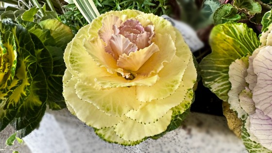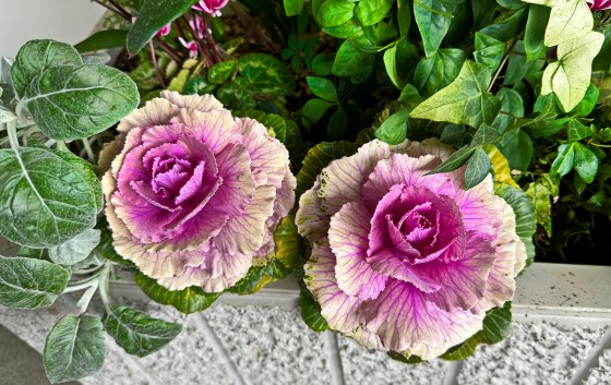 花の少ない冬の季節、特にお正月を飾るのにふさわしい大輪の花は、葉ボタンである。