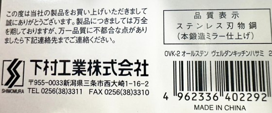 若い頃は刃物類はヘンケルでそろえていたが、今回は国内産でそろえることにした。ただ、下村産業のハサミだと思っていたものが、MADE inCHINAなので、ちょっとがっかりした。