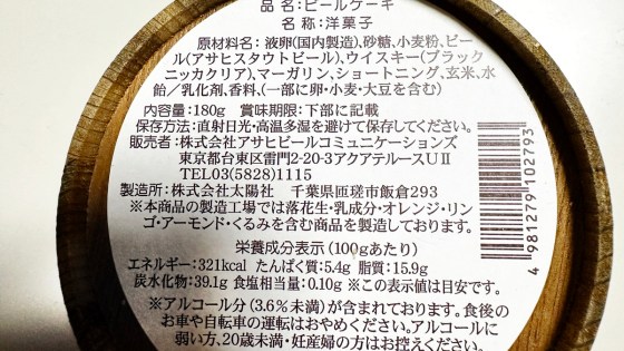 このケーキ、アサヒスタウトビールとブラックニッカクリアが入っている。