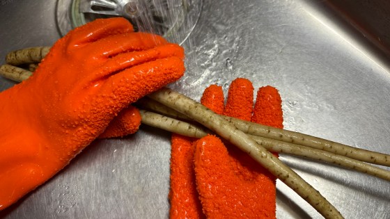 包丁でごしごしやるより、このでこぼこゴム手袋は、ごぼうの皮むきナンバー1である。