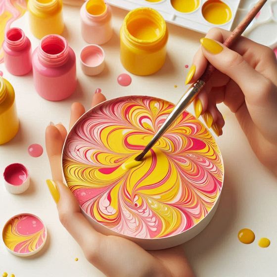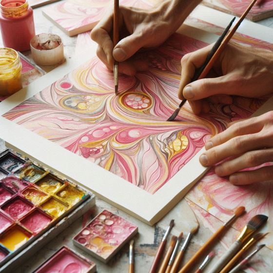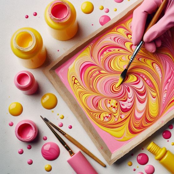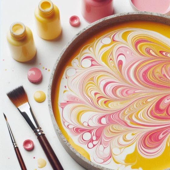 「ピンク系統と黄色系統の色を使ってマーブリングの作品を作成してください。」と書いてみた。