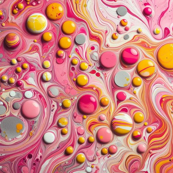 「ピンク系統と黄色系統の色を使ってマーブリングの作品を作ってほしい。」と、AIにお願いしてみたら、濃い絵の具の作品ができてきた。