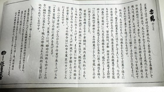 この菓子は留治郎が生涯の師と仰いだ、相国寺四代目管長、故山崎大耕老師の命名により「雲龍」と名付けられ、それまで生菓子でしか創作できなかった菓子が、画期的な一本の棹菓子となり誕生したのです。』