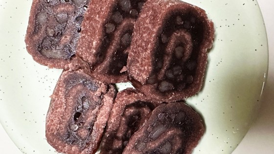 輪切りにして取り分ける。断面が雲の模様になっている。食べてみると普通のあんこのお菓子であるが、作られた当時としては斬新であったのであろう。