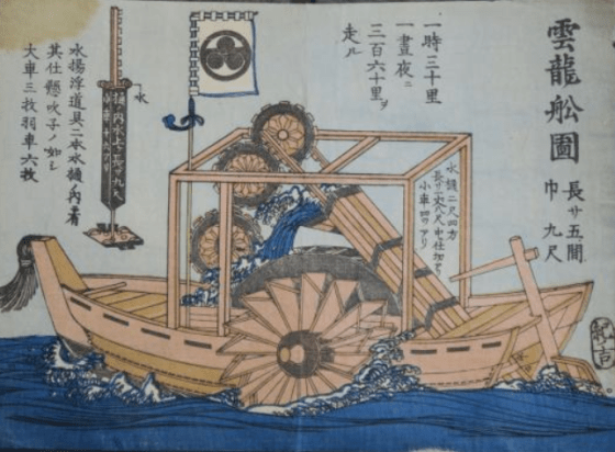 古くは雲龍船という名の船があり、幕末期に考案された水車利用の動力外車船。嘉永六年(一八五三)ペリーのアメリカ東印度艦隊四隻の浦賀来航により刺激された朝野の海防意識高揚のもとに、蒸気船に対抗すべき動力船として考案されたもの。
