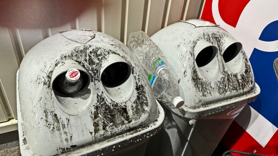 一方のゴミ箱さんの目にはペットボトルが刺さっていて痛々しい。