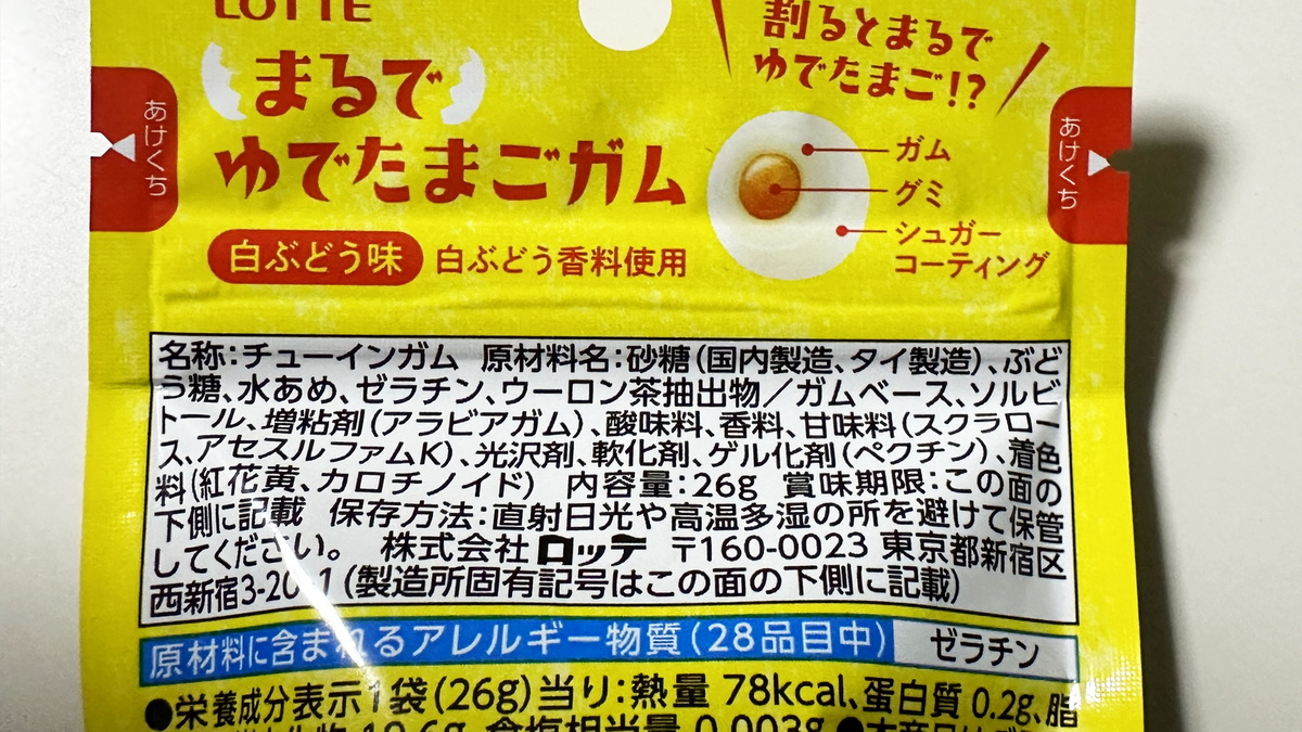 袋のデザインだけを見ていていただけではガムだとは思えなかった。袋の上部をよく見てみると、白ブドウ味と書かれていたので、見た目だけが茹で卵のようなのだと納得した。