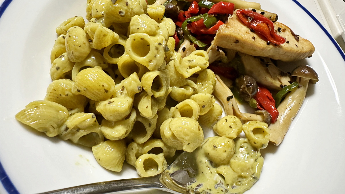 ほうれんそう粉末、バジル、にんにく、タマネギ粉末、ターメリックなどで深いコクと味わいを出しているのだろう。生産国もイタリアと書かれていて、パスタの本場の国で作られている。きっと美味しいと信じて疑わないわたし。